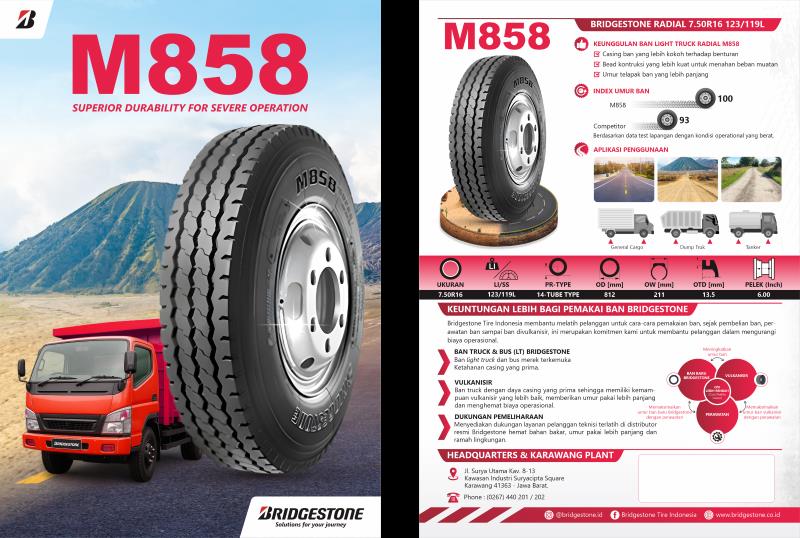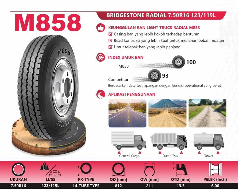 Produk ini hadir sebagai solusi andal kebutuhan transportasi niaga di berbagai medan. Kehadiran M858 sekaligus lengkapi jajaran produk Light & Medium Truck Radial (LSR) Bridgestone yang sebelumnya diisi L330, G530, dan R294.