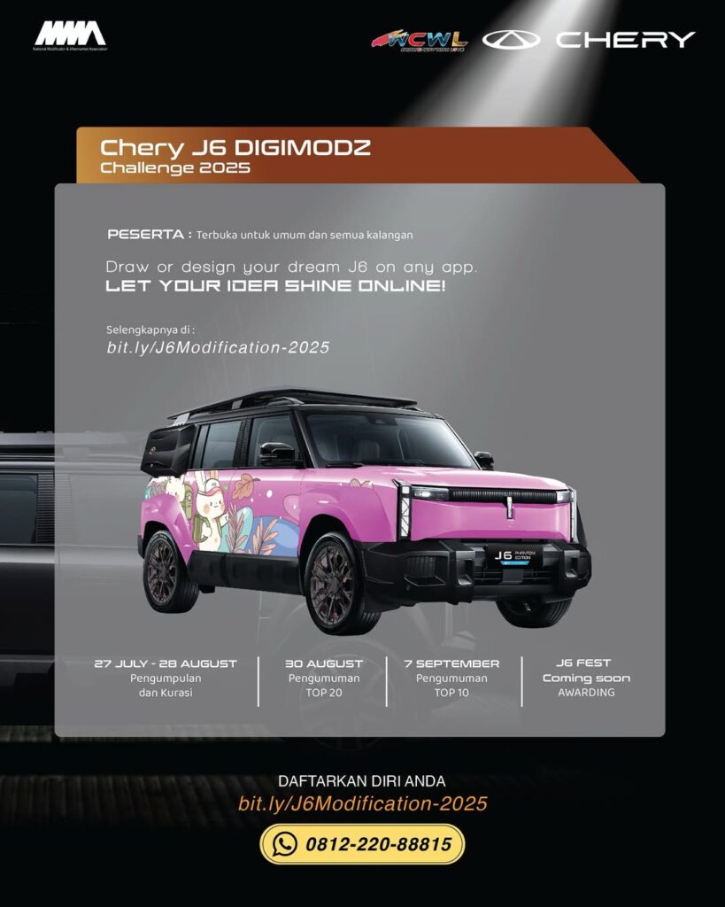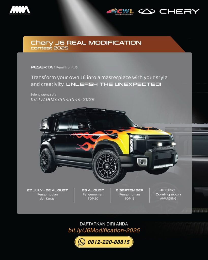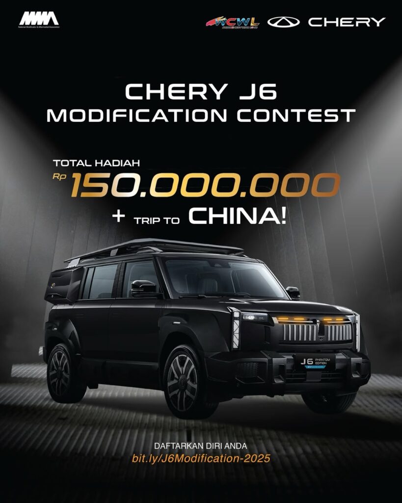 NMAA News – Komunitas modifikasi tanah air kembali dapat kabar seru! Chery Motor Indonesia bersama National Modificator & Aftermarket Association (NMAA) resmi menggelar “Chery J6 Modification Contest 2025” yang terbagi dalam dua kategori: Digimodz Challenge dan Real Modification Contest.