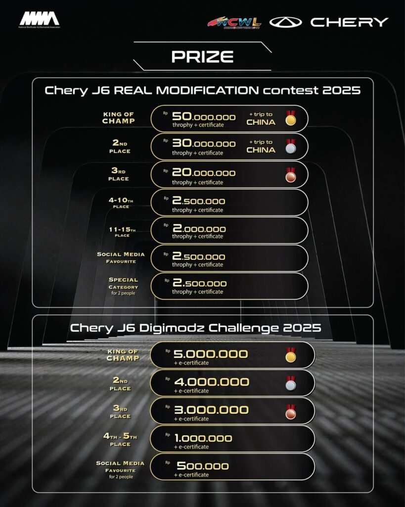 Kompetisi ini terbuka bagi para pecinta modifikasi, baik yang memiliki unit Chery J6 maupun belum. Total hadiah yang disiapkan tidak main-main, ada total hingga Rp 150 juta ditambah perjalanan gratis ke China!