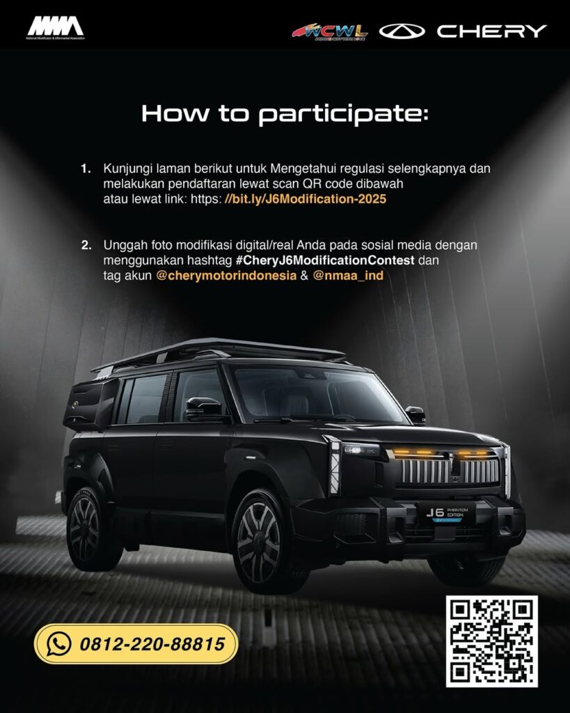 Peserta cukup mengunggah foto atau video modifikasi mereka di media sosial dengan hashtag #CheryJ6ModificationContest, serta tag @cherymotorindonesia dan @nmaa_ind.