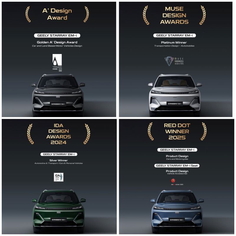 NMAA News – PHRV terbaru Geely Auto yakni Starray EM-i, berhasil meraih empat penghargaan desain bergengsi Red Dot Award, International Design Awards (IDA), Muse Design Awards, dan A’ Design Award.