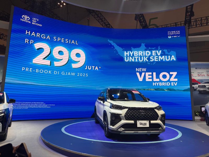Di GJAW 2025, Toyota membuka pemesanan indent untuk New Veloz Hybrid EV, dengan harga spesial Rp 299 juta untuk seri V Grade, khusus pemesanan hingga Desember 2025.