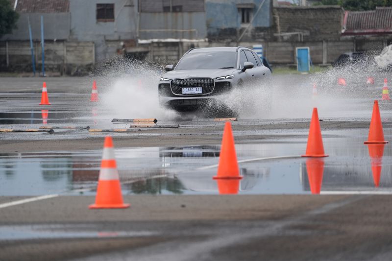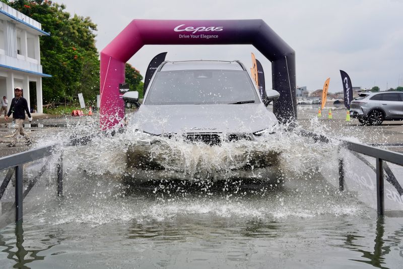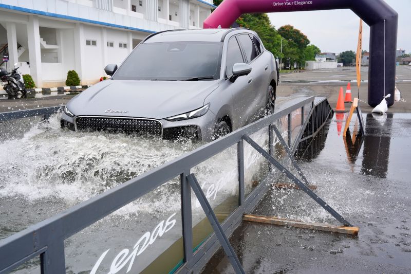 Saat memasuki area simulasi genangan, kendaraan tetap menunjukkan respons yang stabil. Aliran air yang mengenai bagian bawah mobil tidak menimbulkan gejala gangguan pada sistem penggerak maupun kelistrikan.