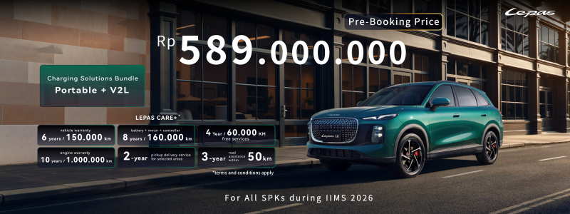 Salah satu program utama yang ditawarkan selama IIMS 2026 adalah harga spesial pre-booking LEPAS L8 sebesar Rp589 juta. Program ini ditujukan bagi konsumen yang ingin menjadi bagian awal dari ekosistem kendaraan elektrifikasi LEPAS di Indonesia.